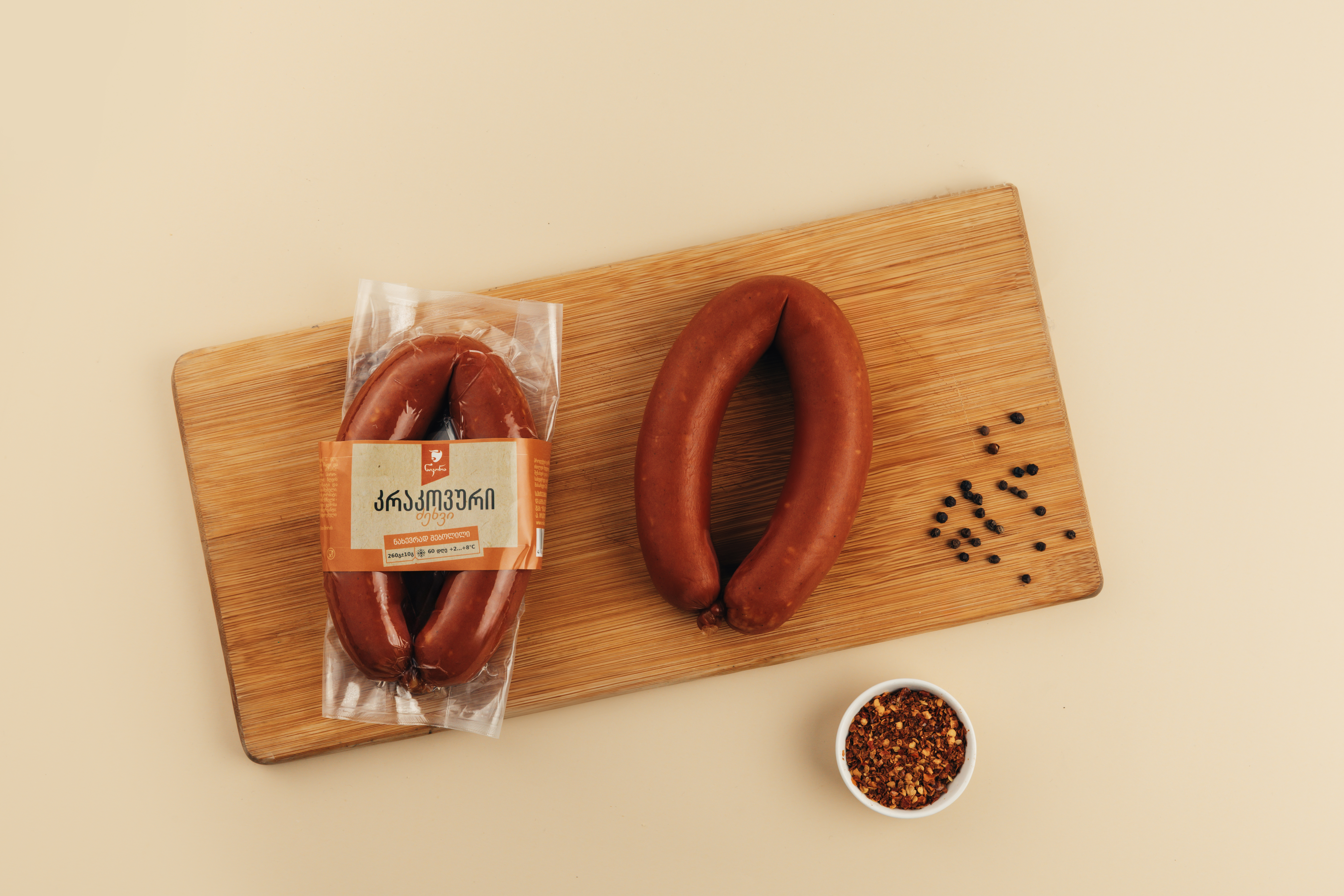 [ღორის ხორცი, ღორის ქონი, ქათმის ხორცი] – 90%, ნატურალური ცხოველური ცილა, სახამებელი, მარილი, წიწაკა შავი და წითელი, ნიორი, შაქარი, მალტოდექსტრინი, სანელებლები, ძმარი,